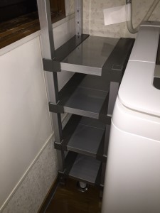 Alumanの一番の特徴の1mm単位のオーダーメイドと自在なカスタマイズ性を活かしたオリジナルラックです。壁と衣類ダンスの間のスペースに合わせて設置し洗濯機と壁の隙間に合わせて複数の棚を配置しました。ちょっと上級者の使い方です(笑)