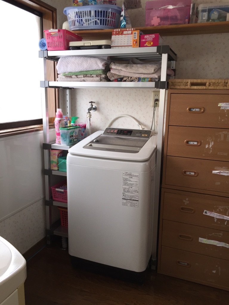 私は「フレームシェルフ」をベースに洗濯機まわりのスペースを有効活用しようと考えました。うちの家内からの要望です。。