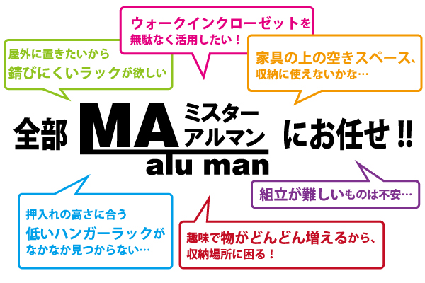 「ミスター・アルマン(Mr.Aluman)」は、お客様のご希望のサイズの収納棚やハンガーラックを、幅・高さともに1mm単位でインターネット注文できるオーダーメイドサービスです。